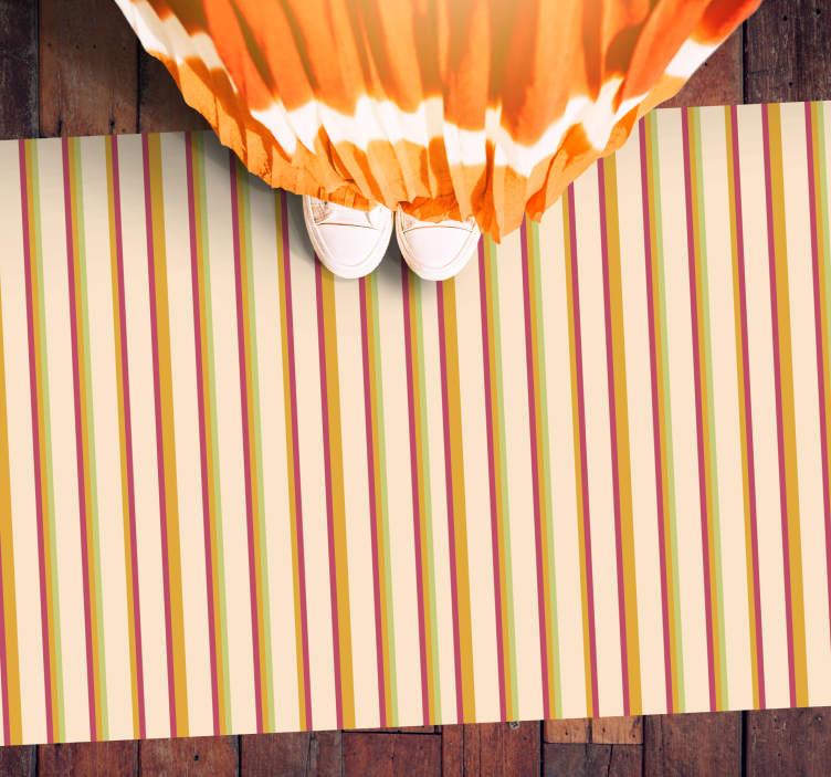 Descubre la alfombra vinílica rayas elegancia multirayas, un exquisito diseño que transforma cualquier espacio en un refugio de estilo. Con un patrón de rayas verticales en colores vibrantes como el amarillo, rojo, verde y beige, esta alfombra se convierte en el centro de atención, aportando elegancia y frescura a tu hogar. Las líneas dinámicas no solo son visualmente atractivas, sino que también crean una atmósfera acogedora y moderna.