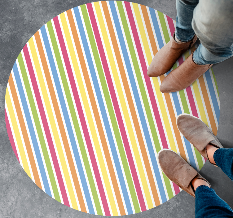 Descubre la alfombra vinílica rayas estilo a rayas vivas, un producto que transformará tu espacio con su diseño vibrante y colorido. Este modelo destaca por sus rayas y líneas en un patrón multicolor, creando un estampado vistoso y lleno de vida que aportará energía a cualquier habitación. Su forma redonda la hace aún más atractiva, ideal para dar un toque moderno y alegre a tu hogar.