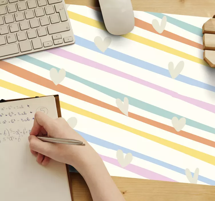 Descubre la Mouse pad texturas rayas de corazones coloridos, una pieza única que combina un diseño juguetón con un patrón de corazones y rayas diagonales en colores pastel. Este estampado alegre transforma cualquier espacio de trabajo en un lugar donde la creatividad fluye y la diversión está a la orden del día. ¡Deja que tu escritorio brille con esta alfombrilla llena de vida!