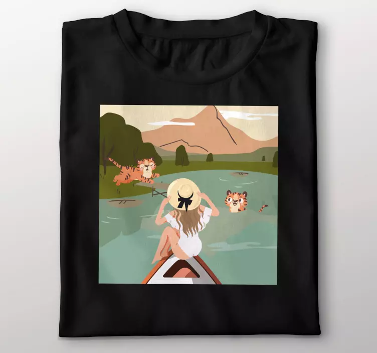 La camiseta aventura con tigres es una pieza única que destaca por su colorido diseño. Muestra a una muchacha relajándose junto a un lago rodeada de tigres y una exuberante naturaleza. Con ilustraciones de estilo dibujos animados, esta camiseta captura la esencia del exterior y la belleza de un paisaje acuático, haciendo que cada mirada a su diseño sea un viaje visual hacia la tranquilidad.