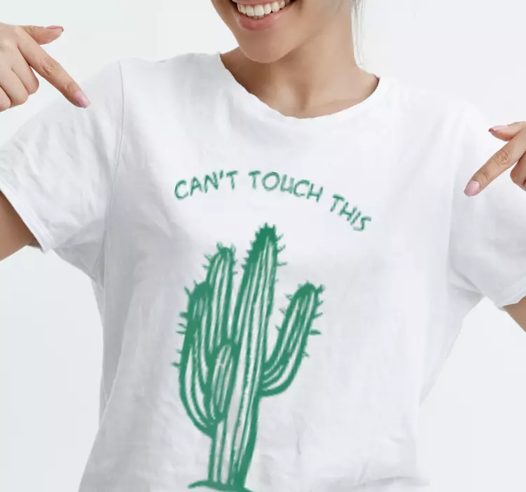 Referencia: T4734Este diseño juguetón presenta un cactus con la frase 'Can't Touch This' encima. El vibrante color verde contrasta maravillosamente con la tela blanca, creando una pieza divertida perfecta para el uso casual. Ideal para quienes aprecian el humor y los estilos únicos.