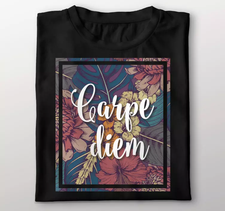Referencia: T4902Este diseño vibrante presenta la frase 'Carpe Diem' entrelazada con elementos florales coloridos. La base negra realza los tonos audaces y alegres, creando una experiencia visual estimulante. Perfecto para quienes aprecian una mezcla de belleza y expresión motivacional.
