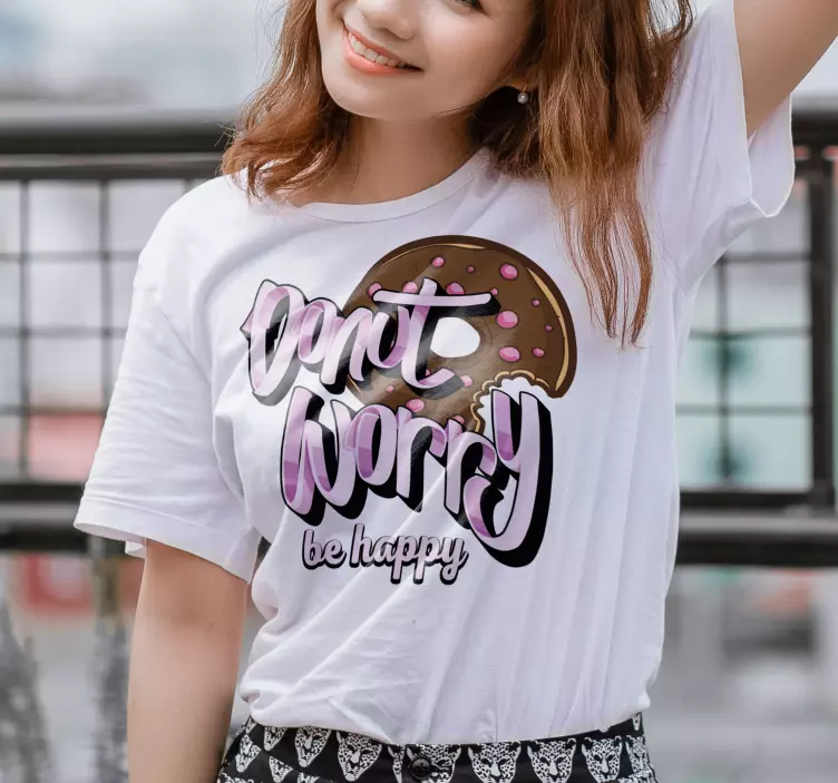 La camiseta no te preocupes sé feliz es una prenda divertida y única que combina un diseño alegre con un mensaje positivo. Con una ilustración de una deliciosa rosquilla, esta camiseta presenta un juego de palabras que invita a todos a dejar de lado sus preocupaciones y disfrutar de la vida. El texto, lleno de energía y buen humor, se convierte en una celebración de la felicidad casual que se refleja en tu atuendo. Perfecta para cualquier ocasión, esta moda no solo te hará lucir bien, sino que también te hará sentir genial.