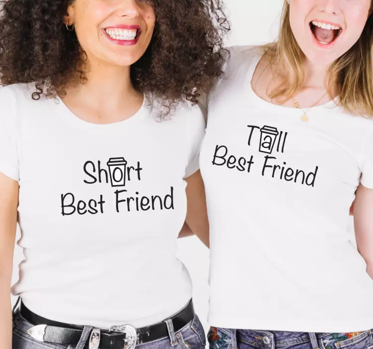 Referencia: T4553Esta imagen presenta a dos amigos que llevan camisetas a juego que etiquetan humorísticamente sus alturas. Una camiseta dice 'Short Best Friend' mientras que la otra dice 'Tall Best Friend'. El texto juguetón enfatiza su camaradería y conexión.