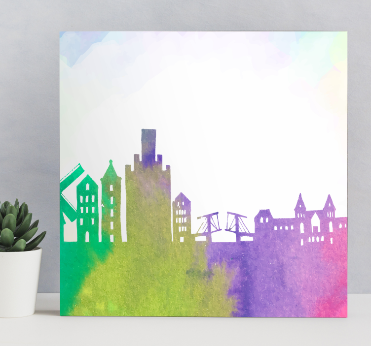 Descubre la belleza de nuestro Cuadro ciudades silueta urbana skyline, una obra de arte que captura la esencia de los Países Bajos a través de un horizonte vibrante. Este diseño en acuarela es una pintura a mano que presenta edificios y puntos de referencia en una composición artística y vistosa que transforma cualquier espacio en una galería personal. ¡Una verdadera joya para los amantes del arte y la decoración!