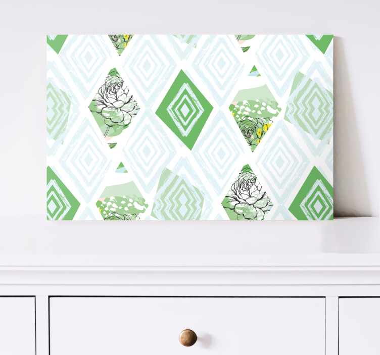 El cuadro de flores con patrón geométrico de suculentas es una obra que combina la belleza de la naturaleza con un diseño abstracto y moderno. Su representación de flores en formas de diamante y rombo en tonos de verde evoca la frescura y vitalidad de las suculentas, creando un ambiente acogedor y lleno de vida. Este maravilloso diseño gráfico es perfecto para quienes buscan una pieza que complemente su decoración con un toque de estilo contemporáneo.