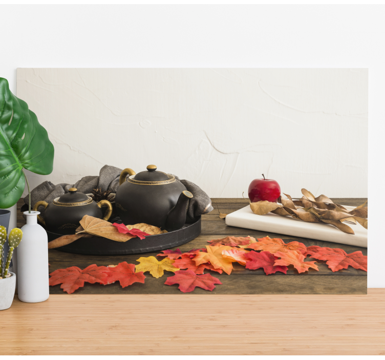 ¡Descubre la belleza del Cuadro paisajes arreglo de té de otoño! Este cautivador diseño presenta una delicada tetera rodeada de hojas de otoño, una mesa rústica y una nature muerta que incluye una manzana. La combinación de colores cálidos y elementos naturales crea una atmósfera acogedora y nostálgica, perfecta para cualquier ambiente.