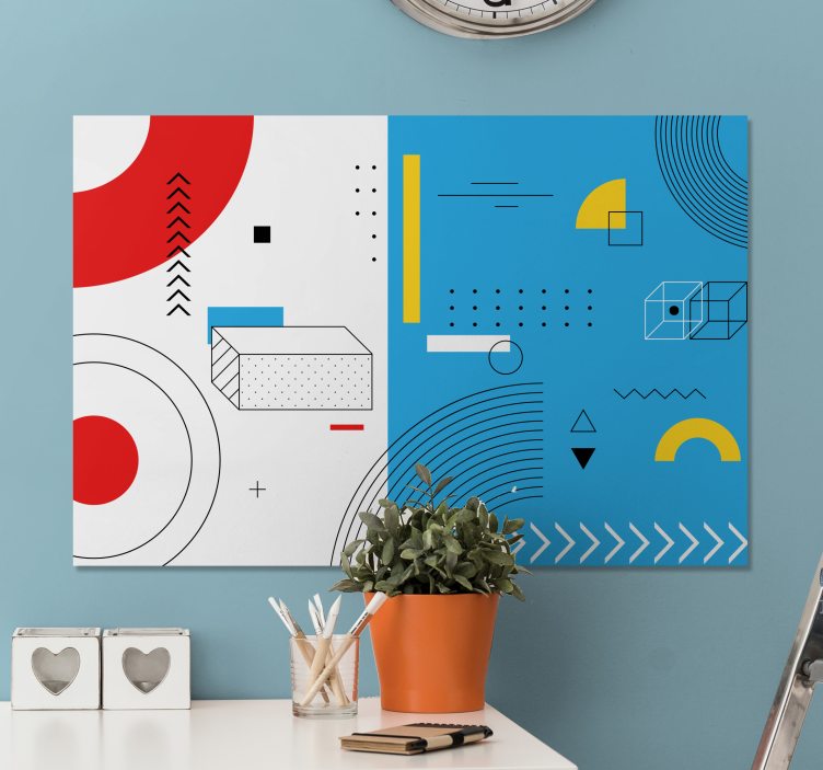 Descubre el arte moderno con nuestro Cuadro figuras geométricas composición de formas, una pieza que presenta un diseño abstracto y vibrante, donde se entrelazan formas geométricas como círculos, triángulos, rectángulos, flechas y topos. Este patrón dinámico y estampado cautivador agrega un toque de energía a cualquier espacio, convirtiéndose en el centro de atención en tu hogar.
