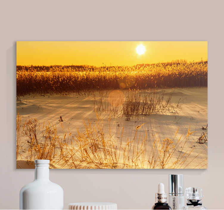 El Cuadro paisajes amanecer dorado es una obra que captura la esencia de la naturaleza en su esplendor. Con una hermosa representación de la hierba de la pampa, un campo vibrante y un atardecer que ilumina la escena con tonos de amarillo, este cuadro invita a la reflexión. El sol brilla intensamente sobre el césped ventoso, creando un ambiente que evoca la serenidad de la naturaleza. Los campos se extienden a lo lejos, ofreciendo una sensación de libertad y paz.