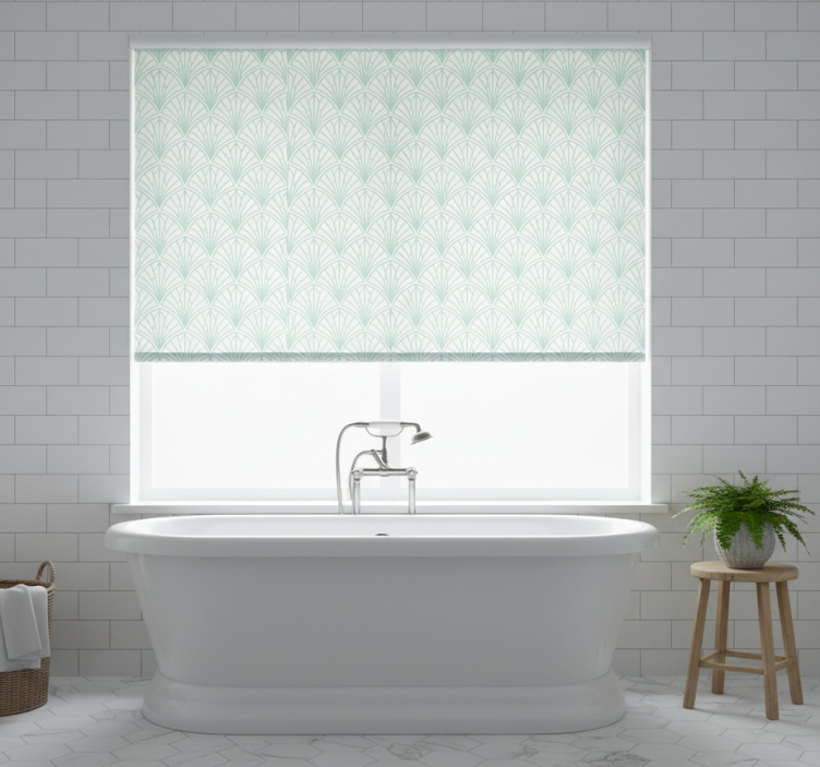 Cortina roller azul hojas aquamarinas sobre fondo blanco