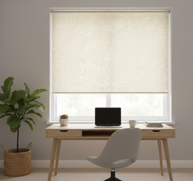 Cortina roller despacho beige y blanco delicado