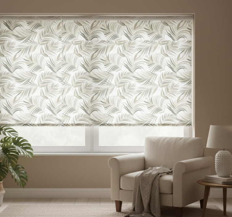 Cortina roller gris con elegantes motivos de hojas