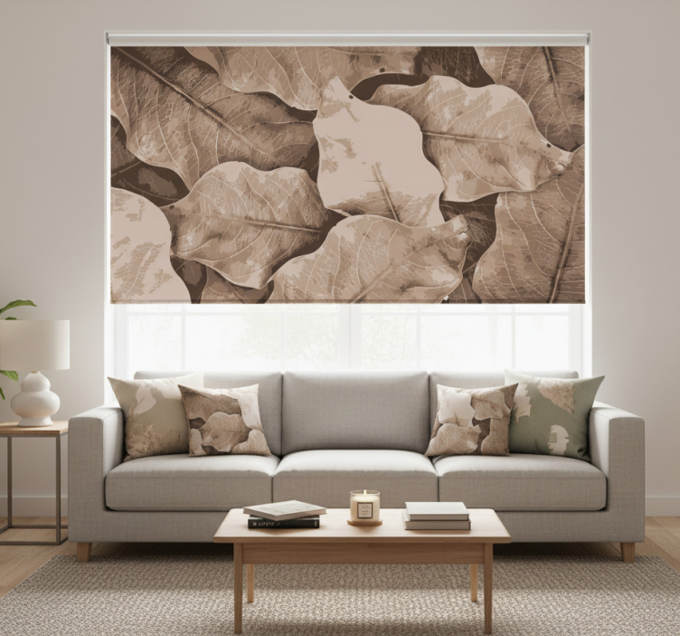 Cortina roller living comedor hojas secas beige