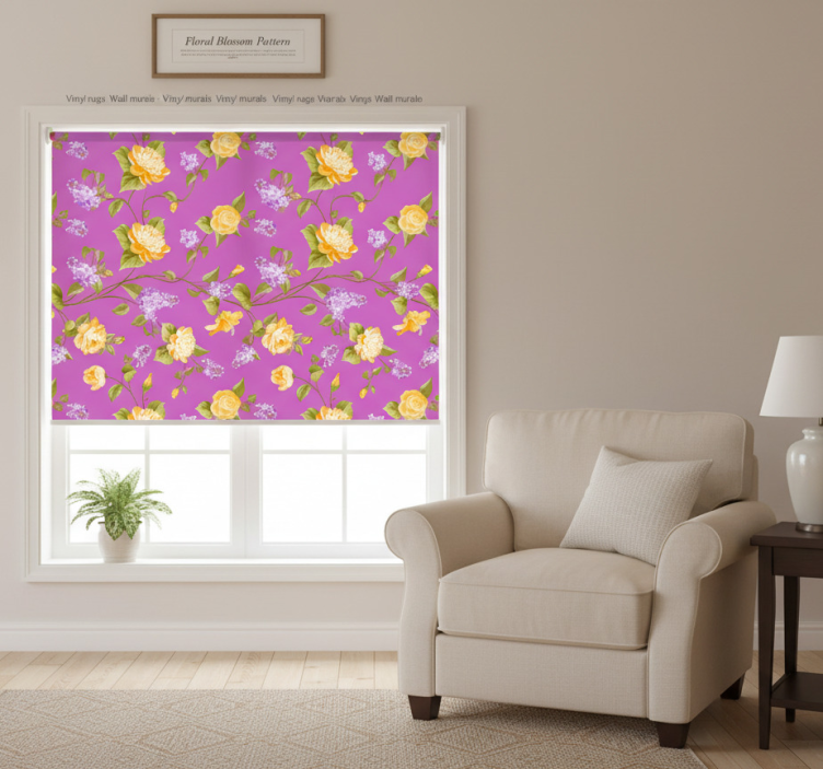 Cortina roller morada con patrón de flores