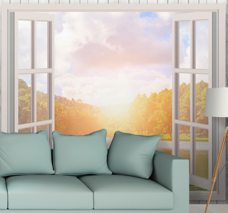 Sumérgete en un paisaje de ensueño con nuestro Papel mural naturaleza amanecer sobre el lago. Este diseño cautivador presenta una ventana a un mundo sereno, donde el amanecer se refleja en un lago cristalino, rodeado de bosques frondosos y majestuosos árboles. La perspectiva de trampantojo te transportará a un atardecer que transforma tu espacio en un refugio natural, lleno de calma y belleza.
