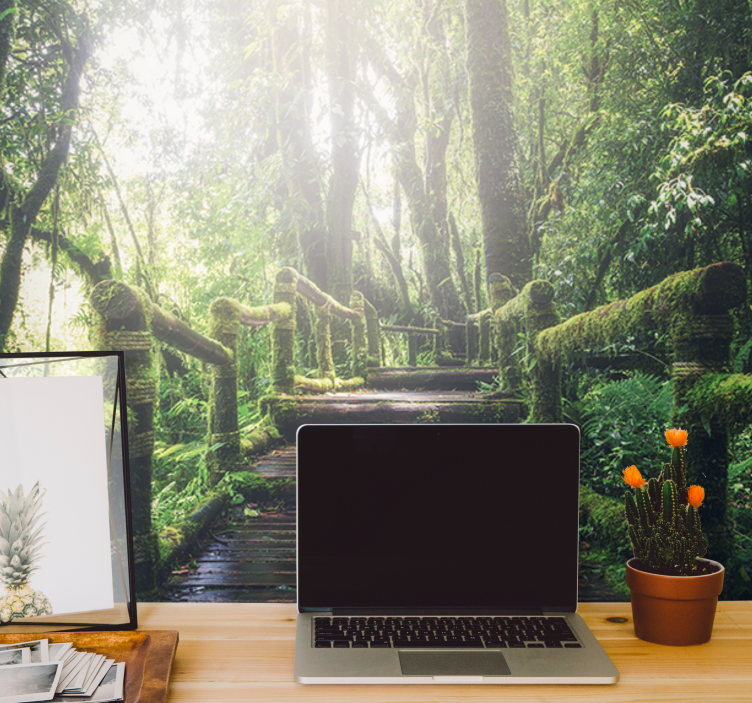 Descubre la magia del papel mural naturaleza sendero boscoso exuberante, donde un sendero rodeado de árboles y naturaleza se ilumina con la luz del sol. Este diseño cautivador presenta una ruta que invita a la aventura, con escalones que te guían a través de un bosque lleno de vida y musgo ligero. Cada detalle de esta fotografía transformará tu espacio en un rincón de serenidad y conexión con la naturaleza.