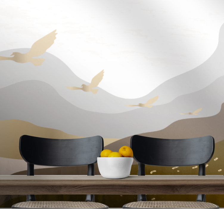 Descubre la belleza de la naturaleza con nuestro papel mural naturaleza siluetas de aves volando. Este impresionante diseño presenta elegantes siluetas de aves volando sobre majestuosas montañas, todo en un sofisticado tono dorado. La ilustración captura la esencia de la libertad y la armonía natural, brindando un toque de serenidad a cualquier espacio.