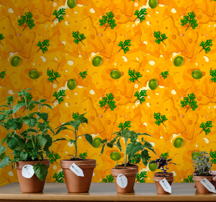 ¡Este es para todos los amantes del queso! Echa un vistazo a este divertido y llamativo papel pintado de cocina lleno de intensos colores amarillo y naranja y formas de queso y hojas de plantas. Es una solución asequible y eficaz para ese cambio deseado en la decoración del hogar de su cocina. ¡Esta cantidad de queso integral sin duda pondrá a todos de mejor humor! Nuestro moderno papel pintado está elaborado con acabado anti-burbujas para que la aplicación sea fácil y sin necesidad de contratar profesionales. Para limpiarlo, utilice un paño húmedo y limpie la suciedad.