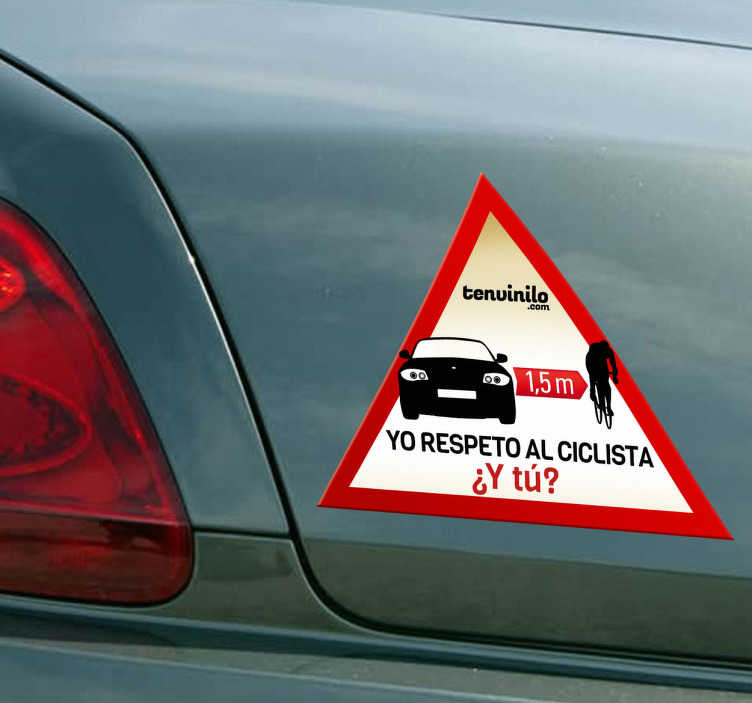 Referencia: D3861Sticker decorativo para tu vehículo formado por una señal de precaución en la que dentro aparecen las palabras “Yo respeto al ciclista, ¿y tú?” junto a la distancia mínima de seguridad que se debe guardar cuando se sobrepasa a uno en la carretera. Cuando se conduce hay que tener conciencia y seguridad, evitando cualquier tipo de riesgo hacia ti mismo y hacia los demás. Todos pueden circular con tranquilidad si se establecen unas normas que se respeten completamente. El adhesivo decorativo está formado por materiales de alta calidad y no le afecta la lluvia o el viento.