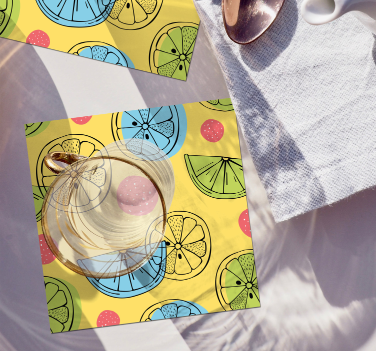 Los posavasos frikis patrón cítrico colorido son una explosión de color y creatividad en tu hogar. Con un diseño vibrante que incluye dibujos de limones y rebanadas, este estampado agriamente juguetón evoca la frescura del verano, invitando a la alegría y a la diversión en cada ocasión. ¡Perfecto para los amantes de las frutas y de los detalles únicos!