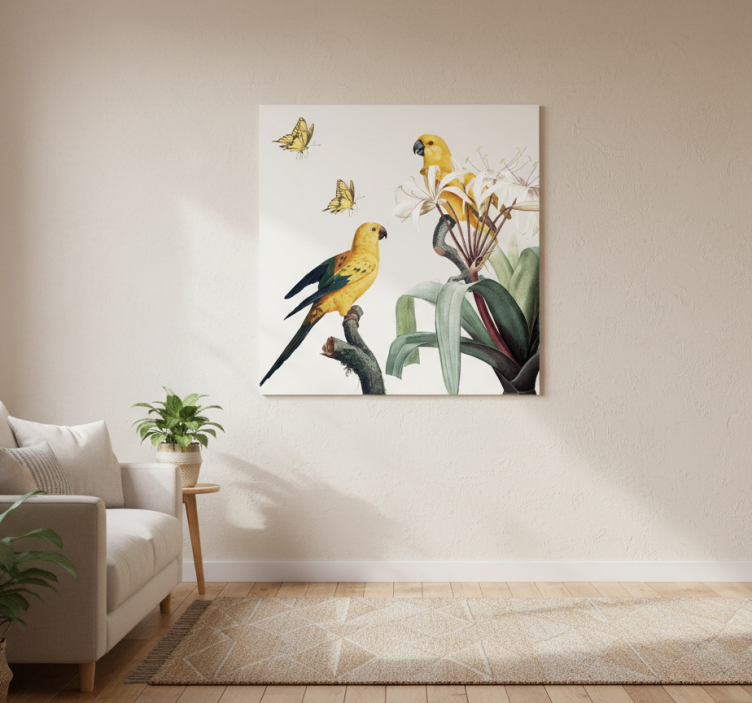 El Poster salón loros con flores amarillas y mariposas es una opción ideal para quienes buscan darle vida a sus espacios. Su diseño alegre y colorido inspira felicidad y optimismo, convirtiendo cualquier habitación en un lugar acogedor y vibrante. Este póster no solo embellece, sino que también invita a soñar y a disfrutar de la naturaleza desde la comodidad de tu hogar. ¡Ideal para salones, habitaciones y cualquier rincón que necesite un toque especial!
