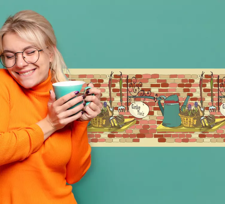 Descubre la increíble cenefa adhesiva exhibidor de herramientas de jardín, un diseño que se inspira en una pared de ladrillo adornada con divertidos dibujo animados y elementos de cocina. Este producto es una cenefa que se convierte en una frontera decorativa perfecta para tu jardín, llenándolo de color y vida. Con una estética familiar y vistosa, es ideal para quienes buscan dar un toque especial a su espacio.