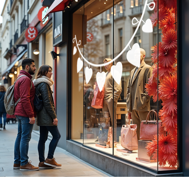 Referencia: A40830¡Transforma tu espacio con la Pegatina San Valentín corazones de semicírculo! Este encantador diseño presenta corazones colgando, ideales para adornar el frente de tu tienda o escaparate en la celebración del amor. Perfecto para los enamorados, este detalle cautivador creará un ambiente romántico y festivo que todos apreciarán durante San Valentín.