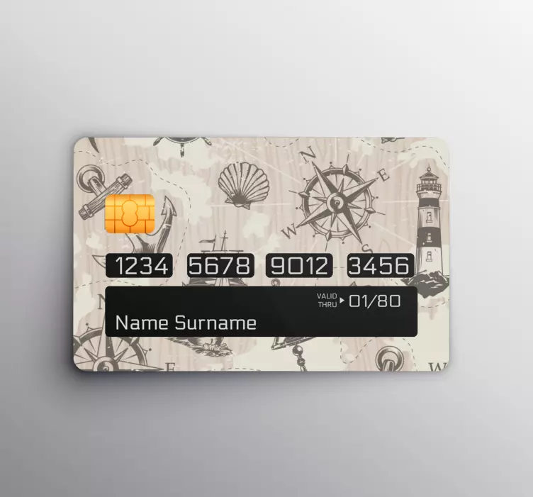 Descubre nuestro Sticker para tarjeta de temática náutica, un adhesivo único que transforma tu tarjeta de crédito en una obra de arte. Con un patrón de anclas y faros, este estampado evoca la esencia del mar. Su diseño incluye elementos como madera, mapas y brújulas, creando una ilustración que hará que tu tarjeta destaque entre las demás.