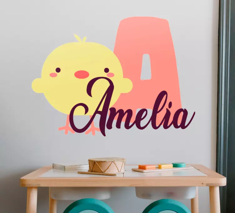 Transforma la habitación de los más pequeños con nuestro Sticker pared infantil diseño de pollito lindos. Este encantador diseño presenta un adorable pájaro de dibujos animados, que incluye una inicial y un nombre personalizado. Su estilo vistoso y juguetón hace que sea la opción perfecta para la decoración infantil, brindando un toque único y personalizable que resalta la personalidad de cada niño.