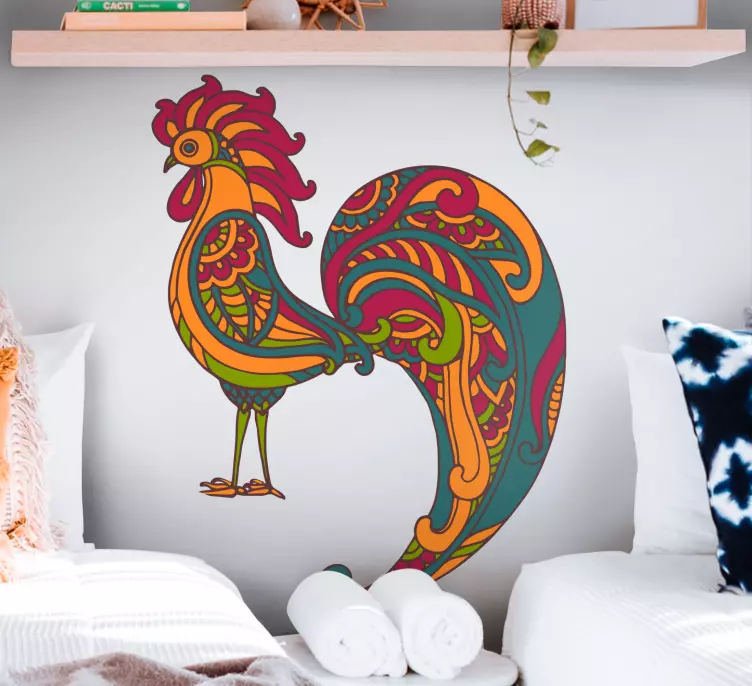 Descubre el vibrante mundo del arte decorativo con nuestro Vinilo animal de granja diseño gallo colorido. Este impresionante diseño presenta una silueta de gallo étnico, adornado con elementos floridos que evocan la esencia de la vida en la granja. Su paleta de colores vibrantes añade un toque de alegría y vitalidad a cualquier espacio, convirtiéndolo en una pieza central que cautivará todas las miradas.