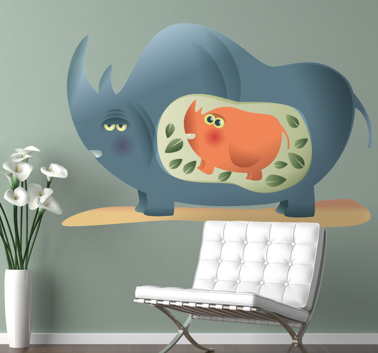 Descubre la magia del Vinilo animal salvaje ilustración de animales juguetones, que presenta un adorable rinoceronte mamá con su bebé en un diseño caprichoso. Este vinilo es una explosión de color, con hojas vibrantes que complementan la alegría del dibujo animado, creando un ambiente juguetón y acogedor en cualquier espacio.