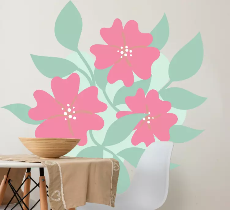 Referencia: A48129Una composición vibrante con delicadas flores rosas rodeadas de exuberantes hojas verdes. Este diseño fresco añade un toque de naturaleza a cualquier espacio, promoviendo una atmósfera alegre y acogedora.