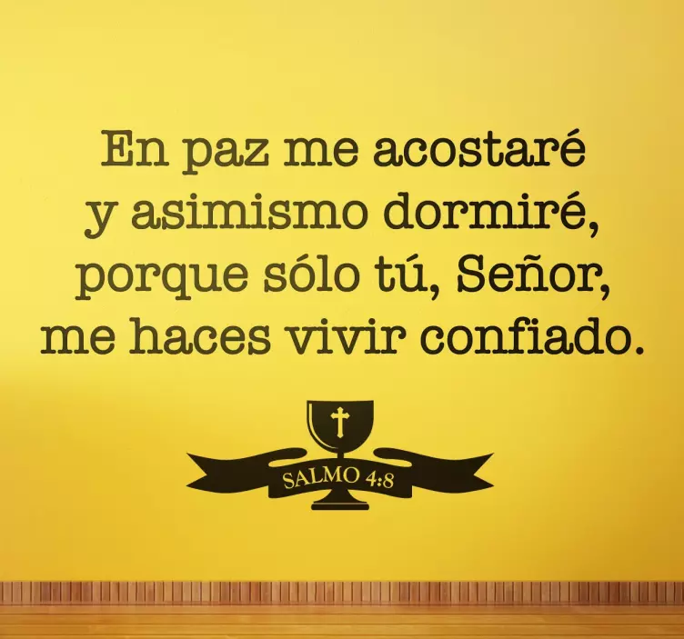 Referencia: A7470¿Amas a Dios? ¿Sigues a raja tabla las normas de comportamiento escritas en el Nuevo o Antiguos Testamento? Hazte con este vinilo pared tan especial en el que se recrean algunos pasajes del libro sagrado. Ideal para decorar templos o tu hogar si eres un ferviente creyente. Aparece el cáliz de Jesucristo y el texto “En paz me acostaré y asimismo dormiré, porque solo tú, Señor, me haces vivir confiado”.