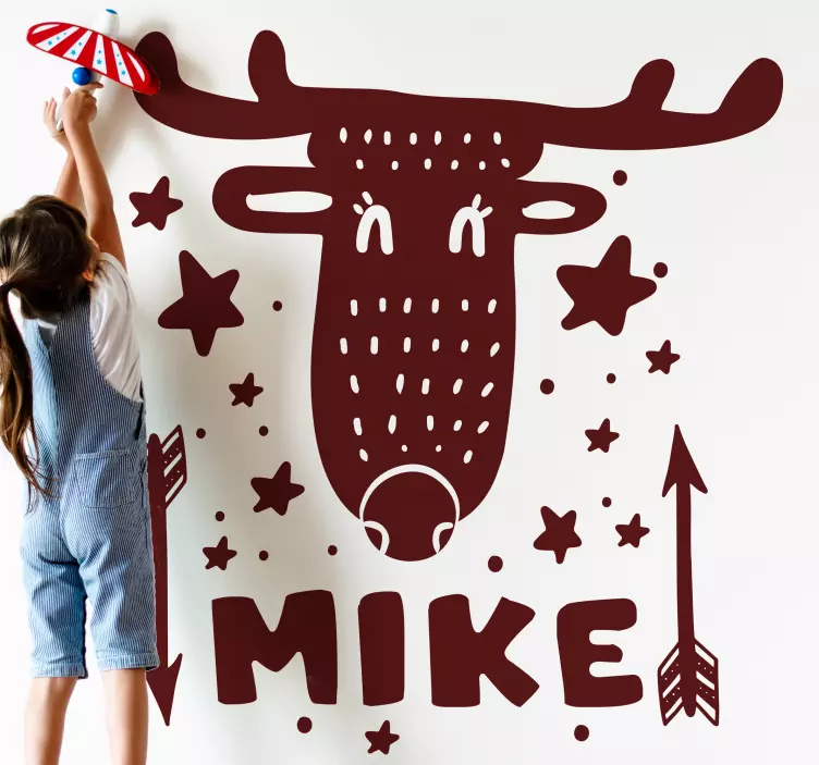 Transforma cualquier espacio con nuestro vinilo decorativo personalizable cara de ciervo fantástica, que presenta un encantador diseño de un reno nórdico rodeado de estrellas y flechas juguetonas. Este vinilo no solo se personaliza con el nombre de tu pequeño, sino que también aporta una atmósfera mágica y acogedora en la habitación de los niños. ¡Una pieza única que hará brillar la creatividad en cualquier rincón!