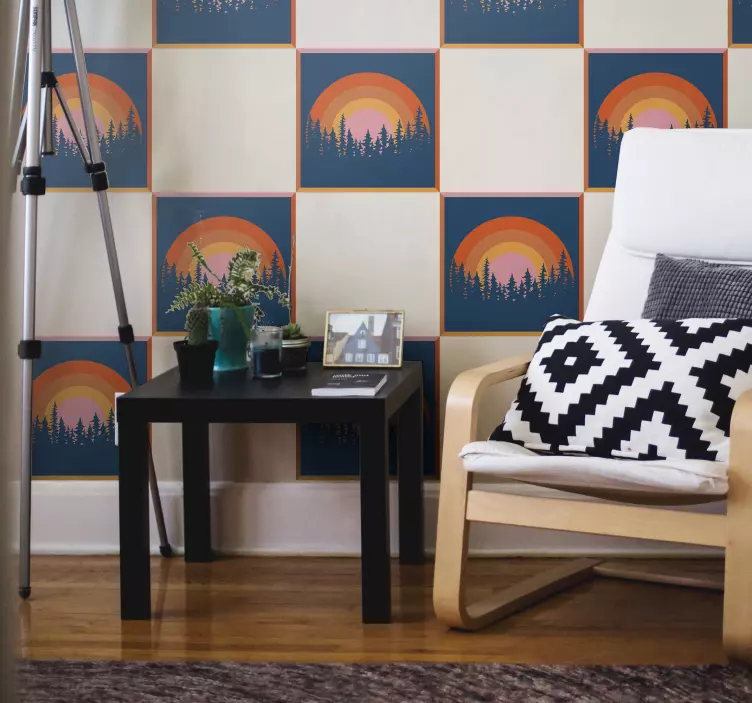 Sumérgete en la belleza del vinilo escena de bosque al atardecer, donde el suave brillo del sol se entrelaza con la majestuosidad de un bosque vibrante. Este diseño cautivador muestra un paisaje idílico que evoca la paz de la naturaleza, con colores cálidos que transforman cualquier espacio en un refugio acogedor. La combinación de azulejos que simulan el atardecer añade un toque artístico, convirtiendo tu hogar en un lugar lleno de vida y serenidad.