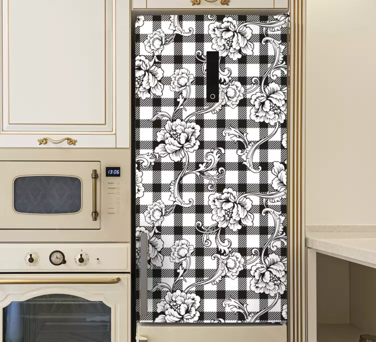 Transforma tu espacio con nuestro Vinilo floral patrón de cuadros florales, un diseño que combina la elegancia del estampado floral con la modernidad de los cuadros. Este vinilo en blanco y negro es perfecto para decorar tu refrigerador, nevera o frigorífico, aportando un toque fresco y sofisticado a tu hogar.