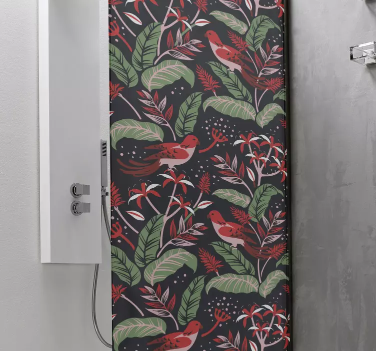 Transforma tu baño en un oasis de naturaleza con nuestro Vinilo mampara baño concepto ave botánica. Este diseño vibrante presenta un hermoso estampado floral que combina hojas y aves en una paleta de colores verde y rojo, creando un ambiente fresco y acogedor que te hará sentir en contacto con la naturaleza cada vez que entres a tu ducha. ¡Es la pieza ideal para dar un toque único y alegre a tu espacio!