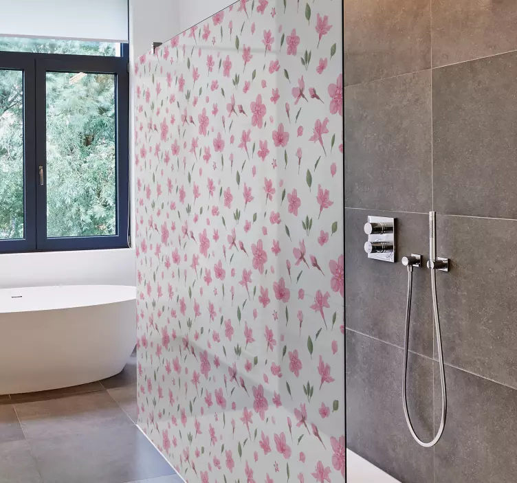 Descubre la belleza natural con nuestro Vinilo mampara baño elementos botánicos, un diseño impresionante que combina la delicadeza de la acuarela con tonos rosados y florales. Este estampado vibrante transforma cualquier espacio de ducha en un oasis de naturaleza, llenándolo de flores y patrones encantadores que evocan serenidad y frescura.