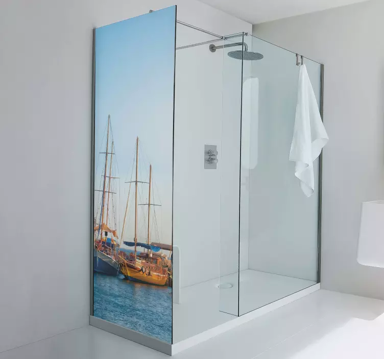 Transforma tu baño en un auténtico puerto marítimo con nuestro vinilo mampara baño escena de barcos a vela. Este diseño encantador muestra una vibrante fotografía de barcos navegando, anclados en un muelle rodeado de agua. Los marineros, con su espíritu náutico, aportan una sensación de aventura y libertad. Este vinilo es perfecto para aquellos que aman el mar y desean llevar un pedazo de él a su hogar, ofreciendo una atmósfera relajante y refrescante en tu ducha.