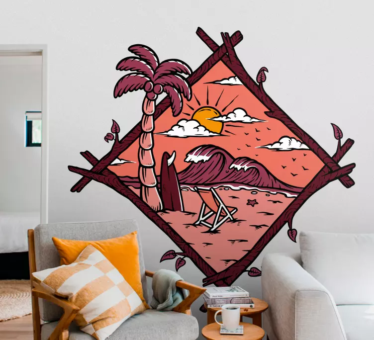 Descubre la magia de la naturaleza con nuestro Vinilo naturaleza escena de playa tropical, un diseño que captura la esencia de un atardecer en la playa. Con un sol radiante, un tablista surcando las olas, palmeras que se mecen suavemente y una silla de playa que invita a la relajación, este dibujo te transportará a un rincón tropical. Las montañas en el fondo añaden un toque de majestuosidad, convirtiendo cualquier espacio en un refugio de paz y serenidad.