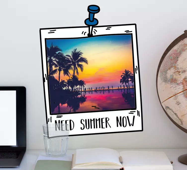 Descubre el encanto de nuestro Vinilo naturaleza paisaje de verano, un diseño que captura la esencia de un atardecer en la playa, con la calidez de las vibras veraniegas. Este vinilo presenta una polaroid que evoca momentos felices, rodeado de palmeras y el texto que invita a disfrutar del ahora. La fotografía vibrante que lo compone transforma cualquier espacio, llevándote directamente a la playa en un instante.