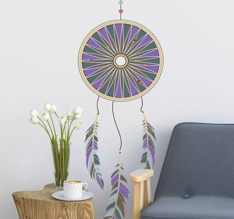 Transforma tu espacio con el vinilo ornamental atrapa sueños, una ilustración vibrante que captura la esencia bohemia. Sus tonos púrpura, lila y morado se entrelazan en un diseño geométrico lleno de vida, adornado con delicadas plumas que añaden un toque etéreo. Este atrapasueños es más que un simple elemento decorativo; es una pieza que invita a la inspiración y la creatividad en cada rincón de tu hogar.