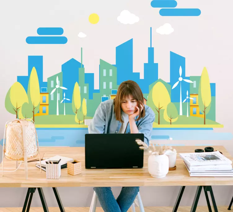 Descubre el vinilo paisaje urbano moderno, una hermosa ilustración que captura la esencia de una vibrante ciudad. Con una silueta elegante de rascacielos y un paisaje que combina edificios contemporáneos, árboles frondosos, y un brillante sol iluminando la escena, este diseño se complementa con turbinas eólicas y un tranquilo agua que refleja la armonía entre la naturaleza y la urbanización.