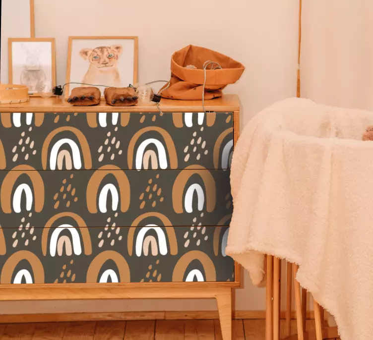 Descubre la magia de nuestro Vinilo para mueble arcos coloridos, un diseño que combina un alegre arcoiris y gotas de lluvia en un patrón geométrico y texturizado. Este estampado es vistoso, moderno y juguetón, ideal para darle un toque único y vibrante a tus muebles y crear un ambiente lleno de vida y color.
