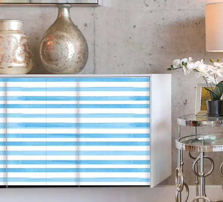 Aplicar el vinilo para mueble motivo rayas azules es muy sencillo. La mejor opción es utilizar cinta adhesiva de doble cara en la parte posterior del vinilo. También puedes optar por enmarcarlo, usando adhesivos más fuertes. Pega las tiras en la parte posterior y sostén cada tira firmemente durante 10 segundos. Otras opciones son las chinchetas y el blu-tack reutilizable, que se aplica como cinta adhesiva. ¡Decora con facilidad!