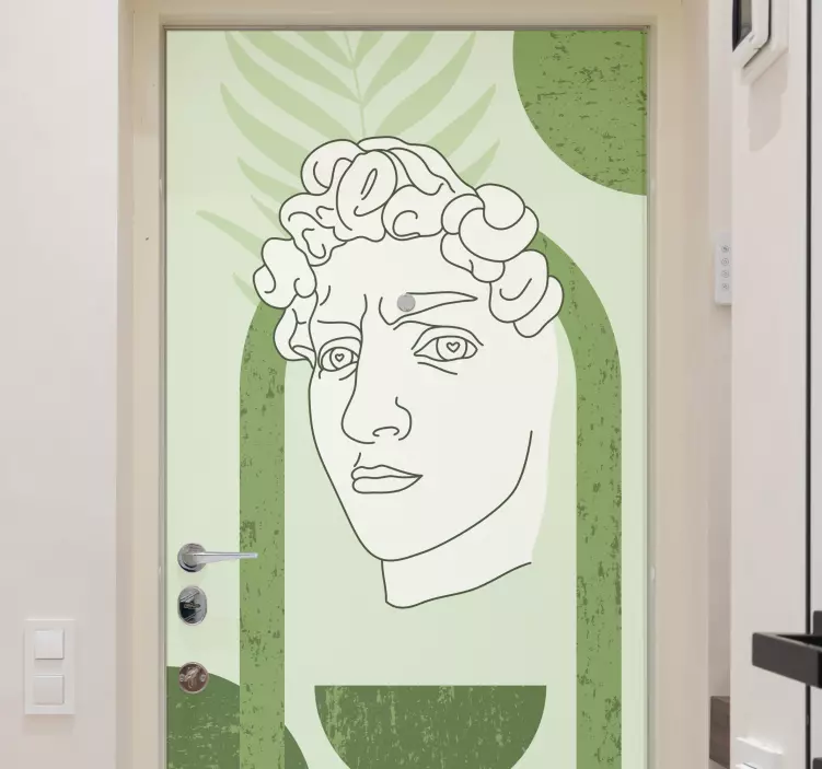 Descubre el vinilo para puerta arte de cara contemporáneo, una pieza única que transforma tu espacio con un diseño gráfico cautivador. Este adhesivo presenta una escultura de la estatua de David en un estilo minimalista, combinando formas abstractas y un elegante arte lineal en tonos verdes. Su diseño moderno añadirá un toque artístico a cualquier puerta, convirtiéndola en un verdadero punto focal en tu hogar.
