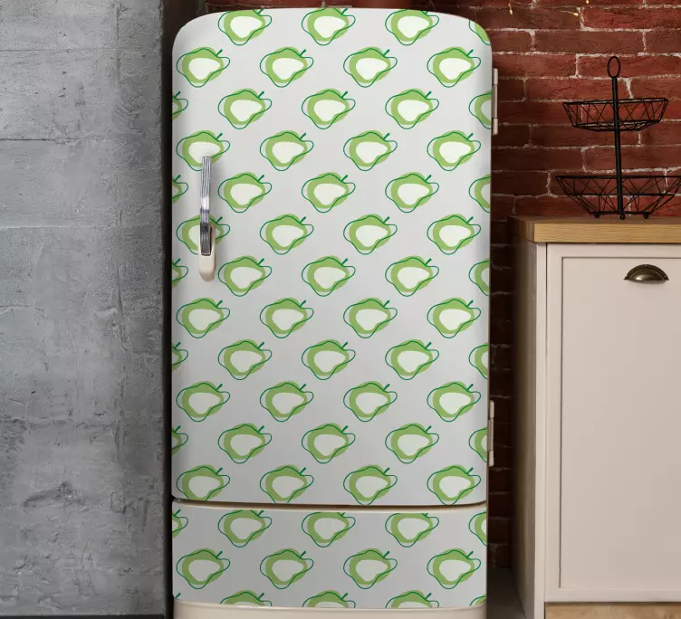 Transforma tu cocina con nuestro vinilo para refrigerador de diseño de frutas. Este hermoso diseño, que incluye manzanas frescas y un patrón vibrante, garabateado con un estampado de fruta, aportará un toque refrescante a tu refrigerador, nevera, frigorífico o heladera. Los detalles en verde invitan a un ambiente alegre y lleno de vida en tu cocina, convirtiendo lo cotidiano en algo especial.