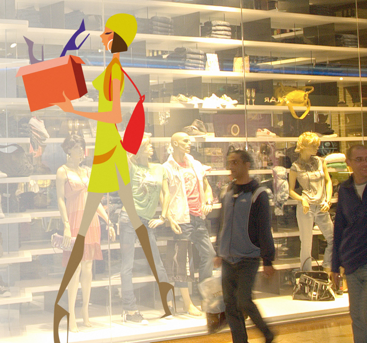 Descubre el Vinilo shopping caja de compras elegante, una pieza decorativa que captura la esencia del glamour moderno. Con un diseño vibrante que presenta a una joven compradora, tacones altos y accesorios de moda, esta ilustración es perfecta para cualquier amante de las compras. Los colores vibrantes realzan la escena, haciendo que cualquier espacio se transforme en un auténtico refugio de estilo y elegancia.